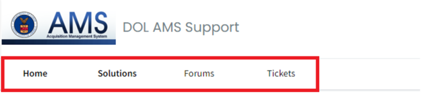 Upon login to the DOL AMS Support Portal, the Home page will display. There are four pages on the DOL AMS Support Portal: Home, Solutions, Forums, and Tickets. Options to navigate to these pages are shown at the top of every page.